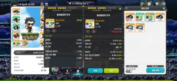 오른쪽 반지가 공격력, 데미지, 보스 몬스터 데미지 모두 높아서 효율이 좋습니다. 왼쪽의 크리티컬 데미지도 좋지만, 오른쪽 옵션들이 전반적으로 우세하네요.