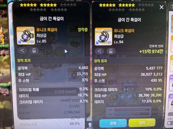 오른쪽 아이템은 크리티컬 데미지 옵션이 붙어있어, 공격력 차이에도 불구하고 훨씬 강력합니다.