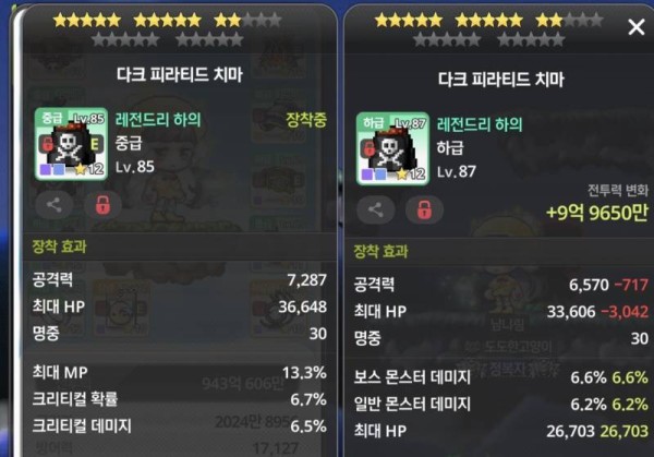 크리티컬 데미지 옵션은 정말 귀한 거라서, 공격력 차이에도 불구하고 왼쪽을 쓰는 게 좋아 보입니다! 보스 몬스터 데미지도 좋지만, 크리티컬 데미지가 훨씬 강력하거든요.
