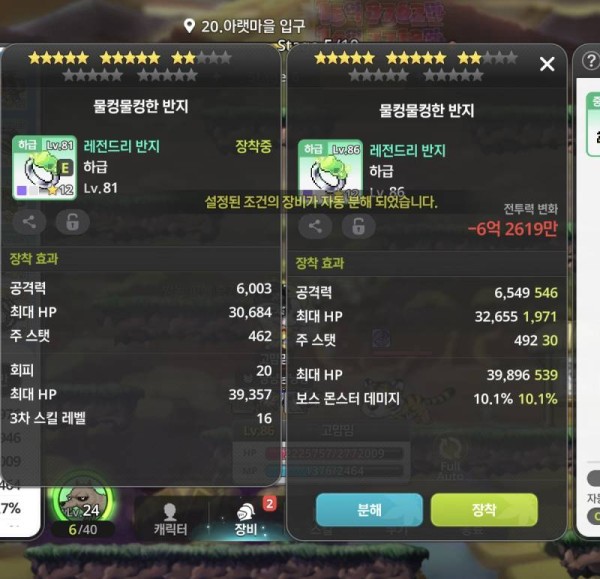 👉 아이템 : '물컹물컹한 반지' 비교 결과, 오른쪽을 추천합니다! 🔍 🔥 오른쪽 : 총 공격력 6,549,546, 보스 몬스터 데미지 10.1% 🔍 왼쪽 : 총 공격력 6,003, 회피 💡 분석 코멘트 오른쪽 반지가 공격력도 더 높고, 랭커 필수 옵션인 보스 몬스터 데미지까지 붙어있으니 무조건 오른쪽입니다! 왼쪽은... 음... 3차 스킬 레벨은 그냥…