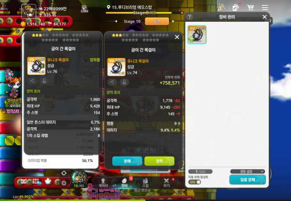 🔍 왼쪽 : 총 공격력 2186, 일반 몬스터 데미지 6.7%, 크리티컬 확률 56.1%