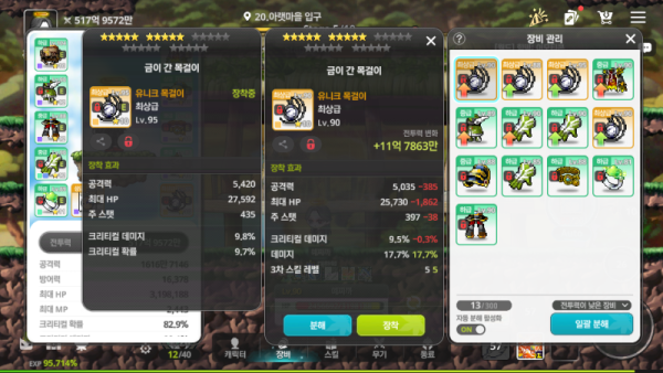 🔍 왼쪽 : 총 공격력 5,420, 크리티컬 데미지 9.8%, 크리티컬 확률 9.7%