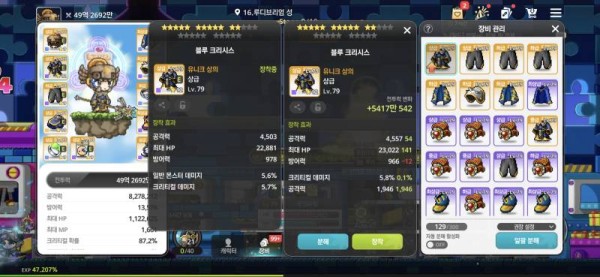 오른쪽 아이템은 추가 공격력과 크리티컬 데미지 옵션이 붙어있어, 왼쪽보다 훨씬 강력합니다. 일반 몬스터 데미지로는 크리티컬 데미지를 따라갈 수 없죠.