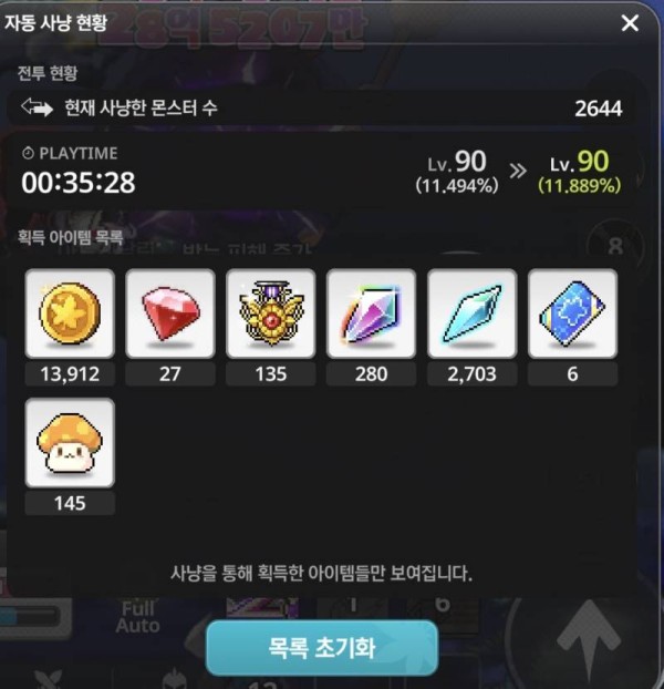 - 분당 마릿수: 약 74.8 마리 몬스터 처치! (2644마리 / 35.47분)