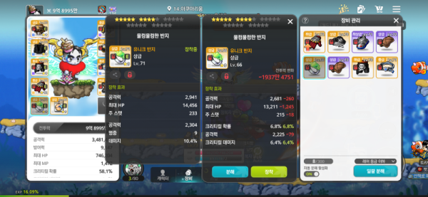 👉 아이템 : '물컹물컹한 반지' 비교 결과, 오른쪽을 추천합니다! 🔍 🔥 오른쪽 : 총 공격력 4,906, 크리티컬 데미지 6.4% 🔍 왼쪽 : 총 공격력 5,245, 데미지 10.4% 💡 분석 코멘트 오른쪽 반지가 총 공격력은 좀 낮아도, [크리티컬 데미지]가 붙어서 화력이 훨씬 잘 나올 겁니다. 쪼렙 구간에서는 크리티컬 데미지가 깡패거든요! ⚠️…