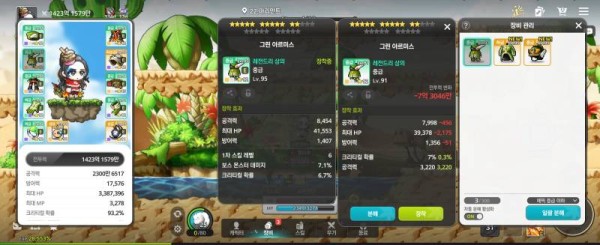 🔍 왼쪽 : 총 공격력 8,454, 보스 몬스터 데미지 7.1%, 크리티컬 확률 6.7%