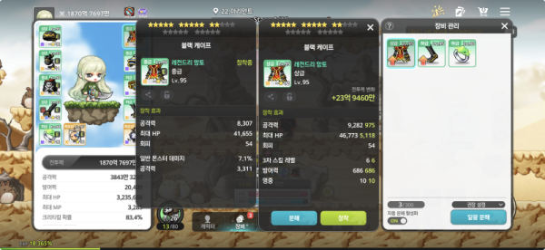 🔍 왼쪽 : 총 공격력 8,307, 일반 몬스터 데미지 7.1%, 공격력 3,311