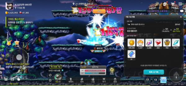 - 무려 3시간 8분 동안 사냥하셨군요! 획득 경험치는 2.12%p, 현재 레벨은 91입니다.