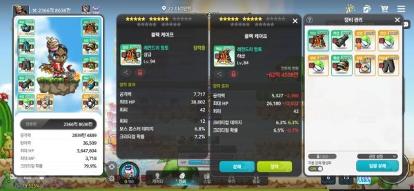 🔍 왼쪽 : 총 공격력 7,717, 보스 몬스터 데미지 6.8%, 크리티컬 확률 7.2%