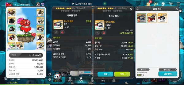 오른쪽 벨트가 공격력도 높고, 보스 몬스터 데미지까지 붙어있어서 사냥에 훨씬 유리할 겁니다. 왼쪽 벨트의 크리티컬 확률과 데미지는 조금 아쉽네요.