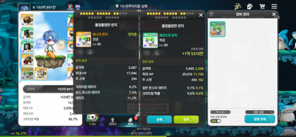 🔍 🔥 오른쪽 : 총 공격력 5,895, 일반 몬스터 데미지 9.1%, 크리티컬 확률 9.6%
