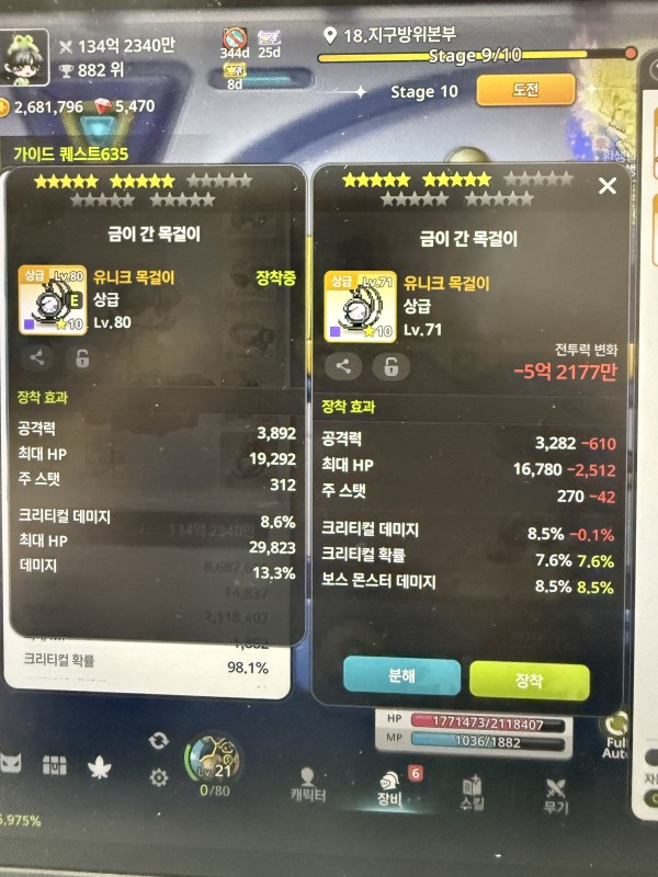 👉 아이템 : '금이 간 목걸이' 비교 결과, 오른쪽을 추천합니다! 🔍 아이템 상세 비교 왼쪽 : 총 공격력 6,600, 데미지 17.7% 🔥 오른쪽 : 총 공격력 6,110, 크리티컬 데미지 9.6%, 보스 몬스터 데미지 9.1% 💡 분석 코멘트 오른쪽 아이템은 총 공격력은 약간 낮지만, 크리티컬 데미지 옵션이 있어서 훨씬 강력합니다. 딜 상승에 큰 …