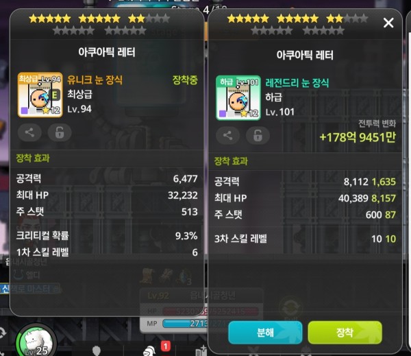 오른쪽 아이템의 기본 공격력이 더 높고, 3차 스킬 레벨이 붙어있어 사냥에 더 도움이 될 겁니다!