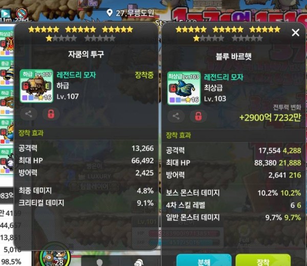 오른쪽 모자가 공격력은 더 높고, 보스 몬스터 데미지까지 붙어있어서 딜 상승에 더 도움이 될 겁니다.