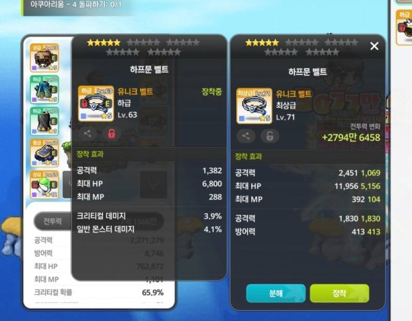 🔍 왼쪽 : 크리티컬 데미지 3.9%, 일반 몬스터 데미지 4.1%, 총 공격력 1,382