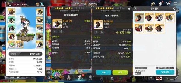 🔍 왼쪽 : 총 공격력 3,425, 최대 HP 19,967