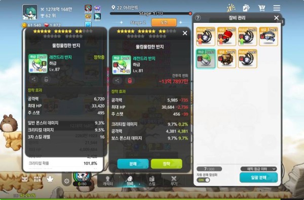 오른쪽 반지는 하단에 공격력, 크리티컬 데미지, 보스 몬스터 데미지까지 붙어있어서 깡패입니다. 총 공격력은 좀 더 높고, 크리티컬 데미지까지 붙어있으니 무조건 오른쪽입니다!