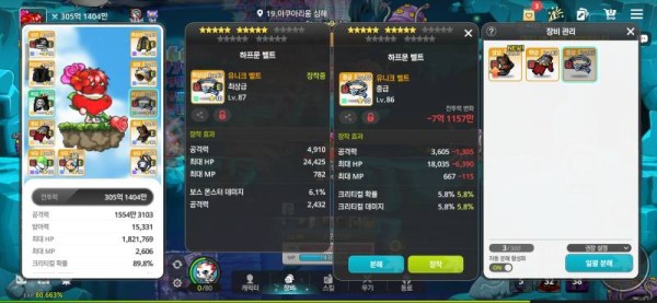 오른쪽 : 총 공격력 3605, 크리티컬 확률 5.8%, 크리티컬 데미지 5.8%