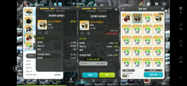 🔍 왼쪽 : 총 공격력 1,708, 크리티컬 데미지 4.1%, 공격력 1,127 (총 공격력 2,835)