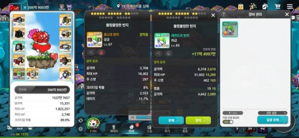 오른쪽 반지는 공격력 합이 월등히 높습니다! 왼쪽의 데미지%도 좋지만, 공격력 차이가 너무 커서 오른쪽을 쓰는 게 훨씬 이득입니다.