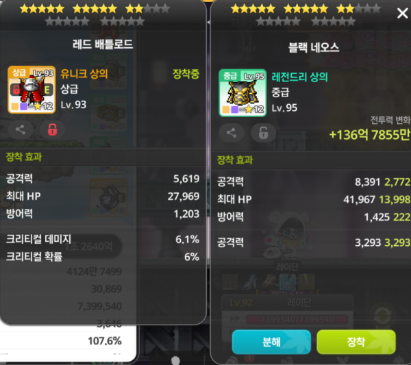 오른쪽 블랙 네오스가 총 공격력에서 앞서고, 깡공격력은 무시할 수 없습니다.