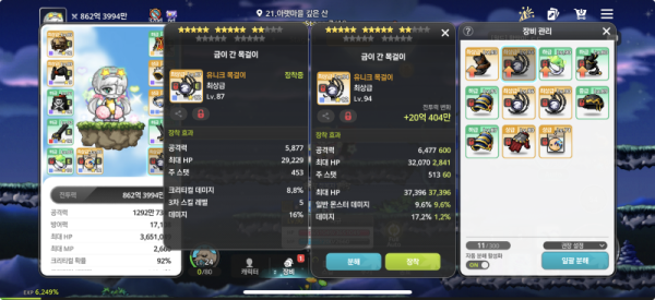 왼쪽 : 총 공격력 5,877, 크리티컬 데미지 8.8%, 데미지 16%