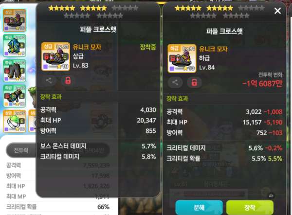 오른쪽은 크리티컬 데미지가 붙어있어 효율이 좋습니다. 왼쪽 아이템의 보스 몬스터 데미지 옵션으로는 오른쪽의 크리티컬 데미지를 따라갈 수 없습니다.