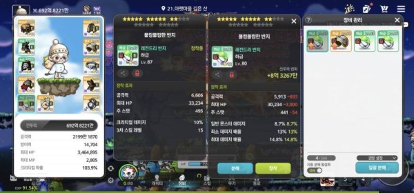 🔍 오른쪽 : 총 공격력 5,913, 일반 몬스터 데미지 8.7%, 최소 데미지 배율 13%, 최대 데미지 배율 14.8%