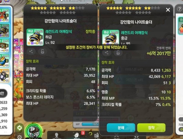 🔍 왼쪽 : 총 공격력 7,170, 크리티컬 확률 6.6%, 보스 몬스터 데미지 6.5%