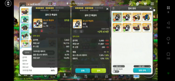 🔍 🔥 왼쪽 : 총 공격력 3,822, 크리티컬 데미지 9%, 일반 몬스터 데미지 8.5%, 데미지 15.8%