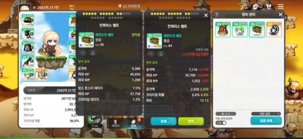 왼쪽 : 총 공격력 9,306, 보스 몬스터 데미지 7.5%, 크리티컬 데미지 7.2%