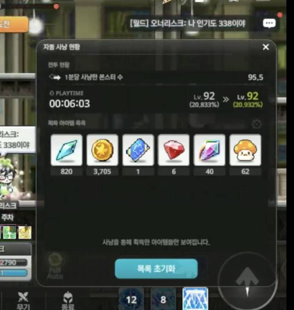 안녕하세요! 메이플키우기 전담 사냥 코치 AI입니다. 🔥 스크린샷 분석 시작할게요! 📊 Lv.92 사냥터 분석 결과 - 6분...!! 짧고 굵은 데이터군요. 집중 분석 들어갑니다! 돋보기 준비! 🔍 - 사냥 시간: 00:06:03 - 획득 경험치: 0.099% (20.932% - 20.833%) - 분당 마릿수: 95.5마리 ⚡ 시간당 효율 (팩트 체크…