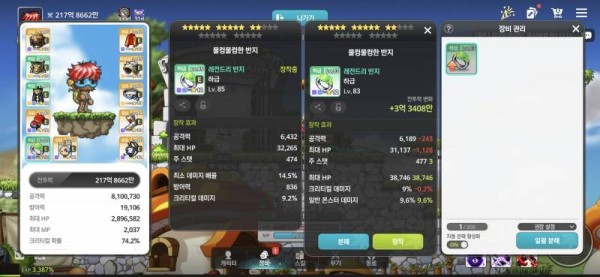🔥 오른쪽 : 총 공격력 6,189, 크리티컬 데미지 9%, 일반 몬스터 데미지 9.6%