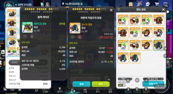 👉 아이템 : '블랙 케이프' 비교 결과, 오른쪽을 추천합니다! 🔍 아이템 상세 비교 왼쪽 : 일반 몬스터 데미지 6.6% 총 공격력 5,635 🔥 오른쪽 : 2차 스킬 레벨 5, 총 공격력 6,422,787 + 3,023 = 6,425,810 💡 분석 코멘트 오른쪽은 2차 스킬 레벨이 붙어있어 왼쪽보다 좋습니다. ⚠️ 경고 아… 열심히 계산했는데, …