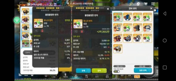 오른쪽 반지에 붙은 크리티컬 데미지가 핵심입니다. 공격력은 조금 더 높지만, 크리티컬 데미지 옵션의 가치가 훨씬 높습니다.