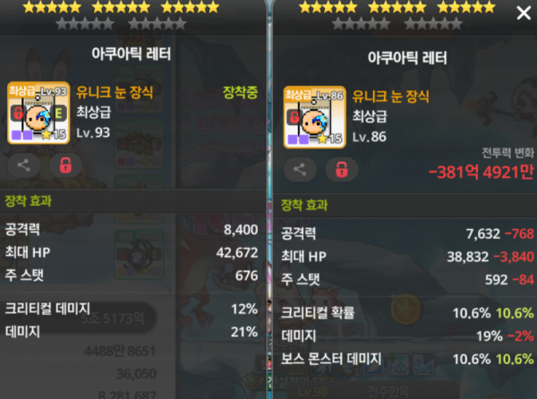 🔍 오른쪽 : 크리티컬 확률 10.6%, 데미지 19%, 보스 몬스터 데미지 10.6%
